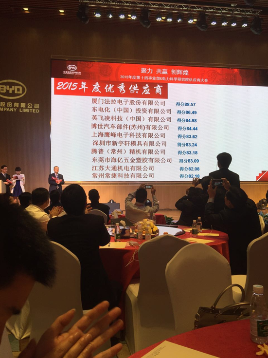参加比亚迪汽车(BYD)第十四事业部&电力科学研究院“2015年供应商大会”照片,并获得“优秀供应商”荣誉称号。